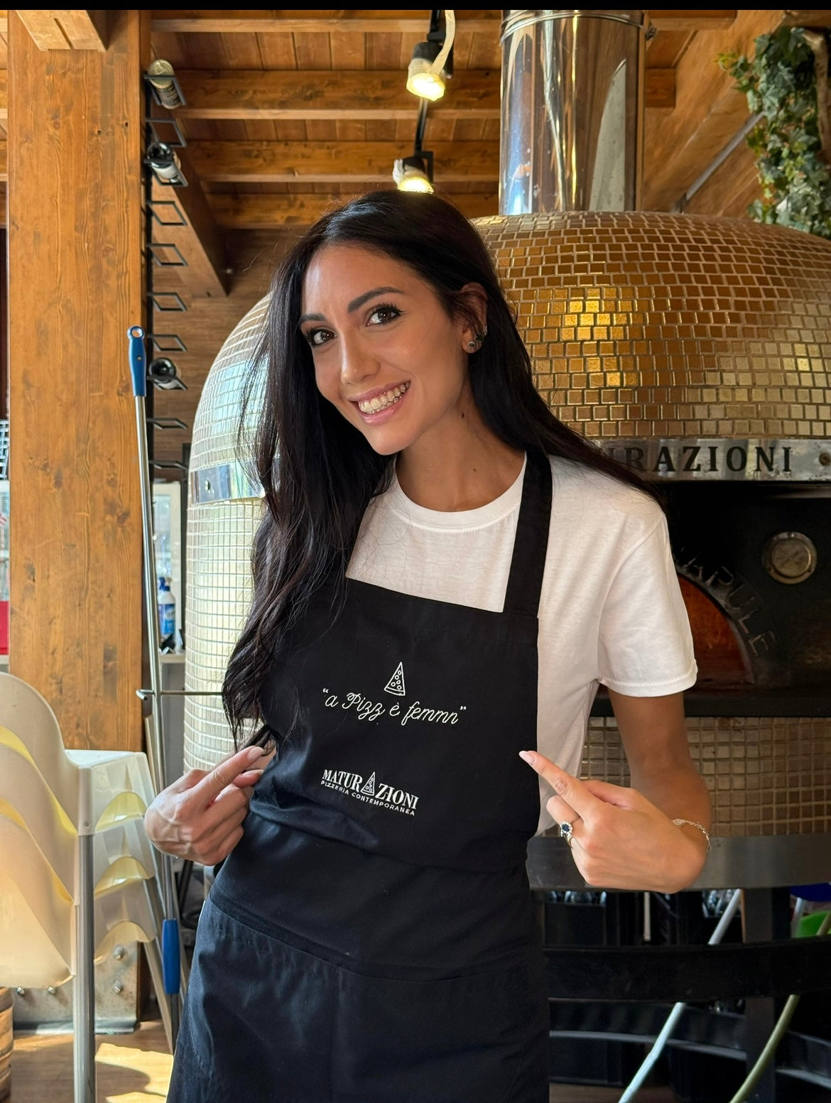 Grembiule nero in cotone con stampa “a pizz è femmn” e logo maturazioni